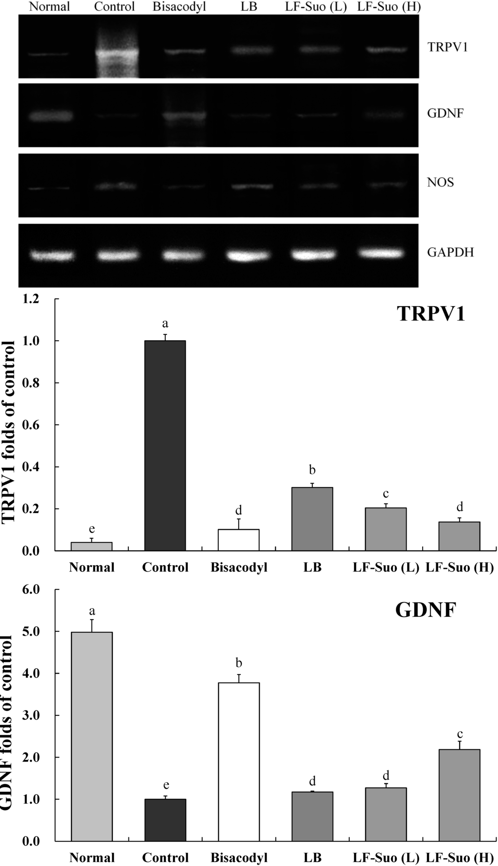 Effects of Lactobacillus fermentum Suo on the mRNA expression of TRPV1, GDNF and NOS in small intestine. n = 10 ICR mice in each group, bisacodyl: 100 mg/kg b.w.; LB: Lactobacillus bulgaricus (1.0 × 109 CFU/kg b.w.); LF-Suo (L): Lactobacillus fermentum Suo (0.1 × 109 CFU/kg b.w.); LF- Suo (H): Lactobacillus fermentum Suo (1.0 × 109 CFU/kg b.w.); a–f Mean values with different letters over the bars are significantly different (p < 0.05) according to Duncan’s multiple range test.