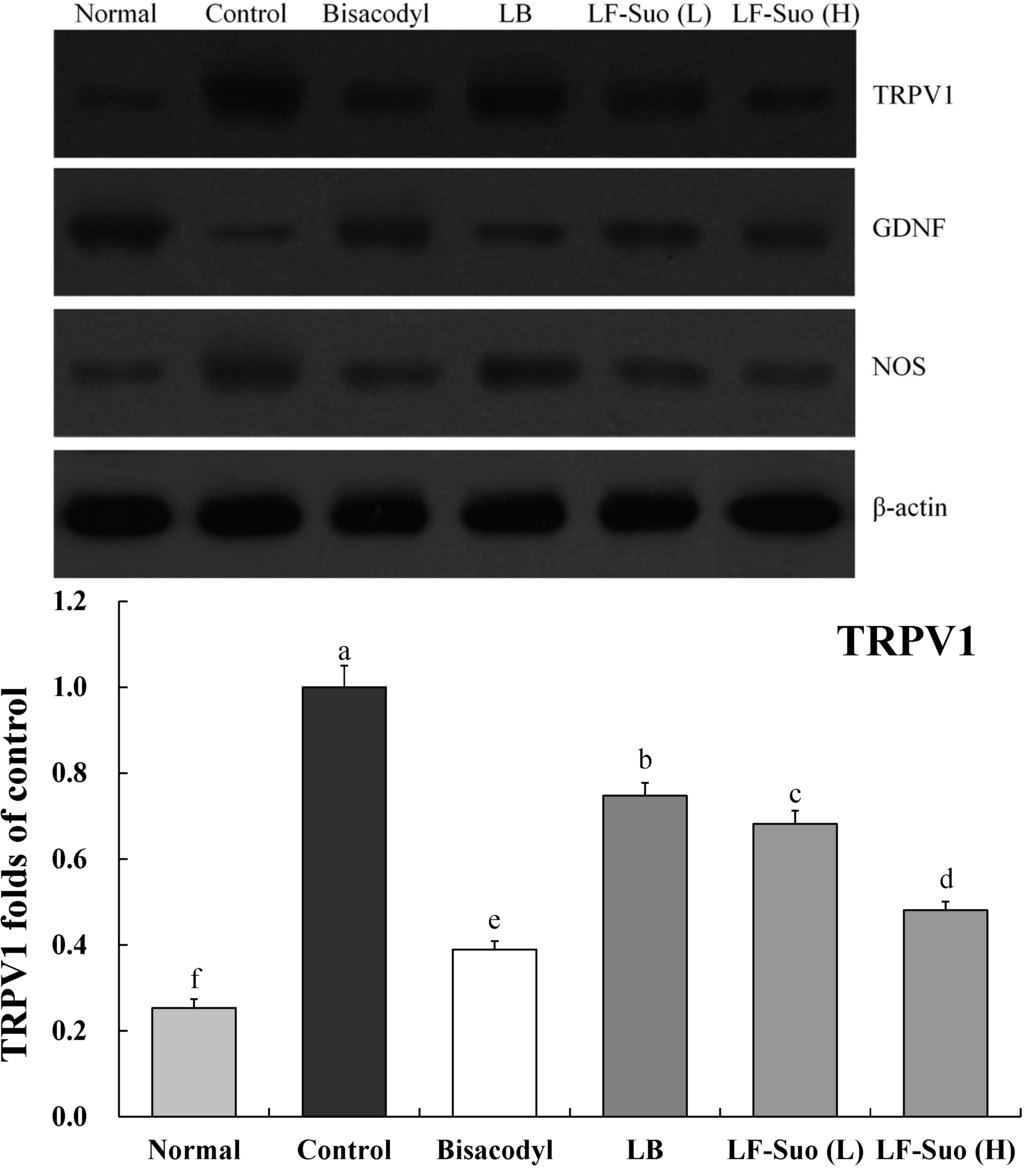TRPV1, GDNF and NOS genes are important enteric nerve-related genes. LF-Suo changed the mRNA and protein expression of TRPV1, GDNF and NOS. mRNA expression of GDNF was increased by LF-Suo treatment (p < 0.05), TRPV1 and NOS expression showed opposite trends (Figure 6 and Figure 7).