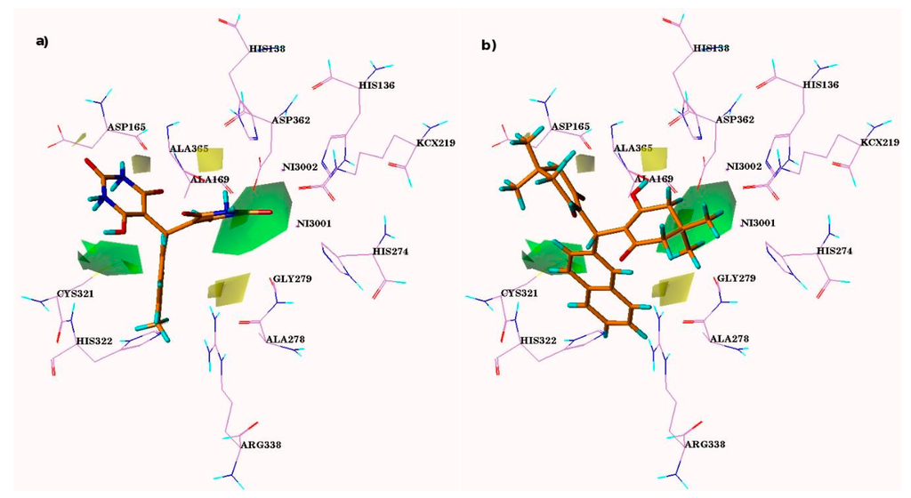 The most active compounds 4i and 5l were superimposed on the CoMFA contours. Two large blue contour maps were found around the pyrimidine ring of compound 4i (Figure 3a,c) suggesting the existence of an electron donating group at this position is required to interact with modified lysine KCX219 and Gly279 residue. In the case of least active compounds 4s-4t, 5f-5g, 5i, and 5s this pyridine ring is replaced by cyclohexenone ring and does not interact with modified lysine KCX219 and Gly279, which significantly lessened the activities of these compounds. Two red contour maps found on the pyrimidine rings near the carbonyl and hydroxyl substituent were representing that the electronegative substitution at this position is suitable for improving its biological activity. These electronegative (EN) moieties interact with NH moiety of catalytic residues (Ala169, Gly279, and Asp362) in protein. Any loss of EN moieties at this position considerably decreases the activity. Another red contour present near the benzene ring of most active compound indicating that any electronegative substitution at this position can enhance the activity. In the least active compounds 4t, 5g, and 5i (Figure 3b,d) carbonyl oxygen is replaced by a different alkyl group, revealing the lesser activities of these compounds.