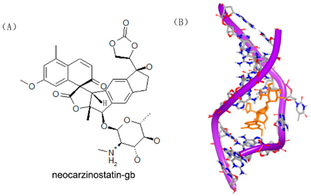 (A) Chemical structure of neocarzinostatin-gb; (B) complex of a DNA with neocarzinostatin-gb (PDB code: 1KVH); (C) chemical structure of neocarzinostatin-glu; and (D) complex of DNA with neocarzinostatin-glu (PDB code: 1MP7). The orange structure represents the small molecule; the purple structure represents the backbone of nucleic acid; the blue and red atoms in the molecule represent nitrogen and oxygen atoms, respectively.
