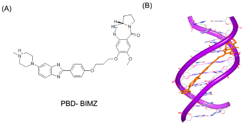 (A) Chemical structure of PBD-BIMZ; (B) complex of a DNA duplex with PBD-BIMZ (PDB code: 2KTT); (C) chemical structure of PBD-naphthalimide; and (D) complex of a DNA duplex with PBD-naphthalimide (PDB code: 2KY7). The orange structure represents the small molecule; the purple structure represents the backbone of nucleic acid; the blue and red atoms in the molecule represent nitrogen and oxygen atoms, respectively.