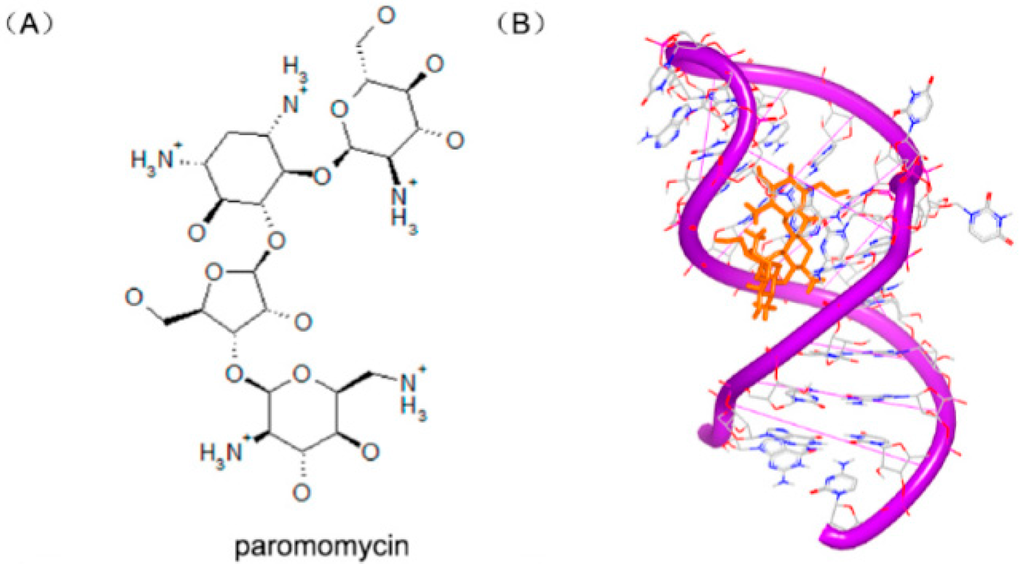 Other aminoglycoside compounds have also been determined and reported. The paromomycin (Figure 22A) is also called monomycin and aminosidine. The detailed complex of two paromomycin molecules and an RNA fragment was solved. The molecule is located in the deep position of the RNA groove forming hydrogen bonds with water, as shown in Figure 22B []. Neomycin B (Figure 22C) is an aminoglycoside antibiotic different with paromomycin. Neomycin B contains an ammonium group not hydroxyl group in the structure. The complex structure (Figure 22D) of neomycin B and RNA duplex shows a similar interaction, compared to other aminoglycosides [].