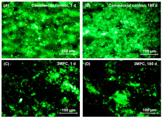 Typical live/dead assay images of oral biofilms adhering on samples are shown in Figure 3. The commercial control was fully covered by live bacteria. In contrast, the 3MPC composite had little bacterial attachment. The composite with 1.5% DMAHDM had great antibacterial property, yielding lots of dead bacteria. The 3MPC + 1.5DMAHDM composite had less bacterial attachment, and the bacteria were mostly dead. There was no significant difference between 1 day and 180 days samples, showing that the protein-repellent and anti-biofilm function was not lost during 180 days of water-aging.