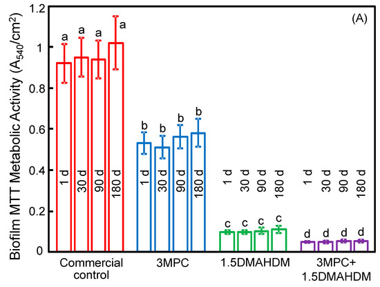 The MTT assay was used to determine the metabolic property of oral plaque biofilms [26,27,40]. Disks with oral biofilms that had grown for two days were placed in a new 24-well plate. One mL of MTT dye (0.5 mg/mL) was added into each well and incubated for 1 h at 37 °C in 5% CO2. Then, the samples were moved to a new 24-well plate, and 1 mL of dimethyl sulfoxide (DMSO) was added to solubilize the formazan crystals. After incubating for 20 min with moderate shaking in a darkroom, 200 µL of the DMSO solution from each well was collected, and its absorbance at 540 nm was evaluated via a microplate reader (SpectraMax M5, Molecular Devices, Sunnyvale, CA, USA).