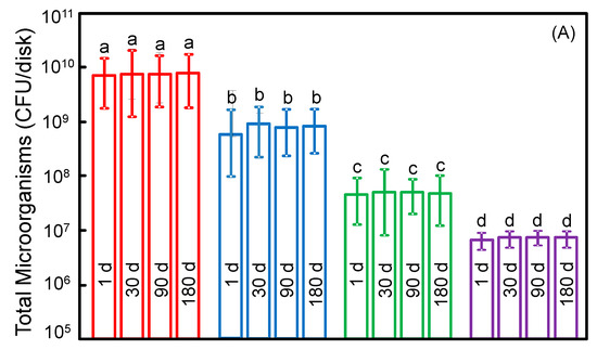 Colony-forming unit (CFU) counts for: (A) total microorganisms; (B) total streptococci; and (C) mutans streptococci (mean ± SD; n = 6). CFU counts on the 3MPC + 1.5DMAHDM composite were three orders of magnitude lower than commercial composite (p < 0.05). There was no significant difference of CFU before and after 180 days (d) (p > 0.1), demonstrating that the anti-biofilm function was not lost in long-term water-aging. Bars with dissimilar letters indicate values that are significantly different from each other (p < 0.05).