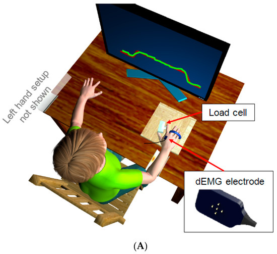 Participants were seated in a darkened room facing a 27-inch Dell (Dell Inc., Dallas, TX, USA) LCD monitor (resolution: 1920 × 1080; refresh rate: 120 Hz) located 60 cm in front of them. They sat with their shoulder abducted at 45°, elbow flexed and forearm resting on a customized arm brace (Figure 1A). The arm brace was clamped to a table to keep participants’ arm position stable throughout the test. Participants’ dominant hand (i.e., the left hand was used for left handed individuals) was pronated and laid flat with digits comfortably extended on a hand plate with their middle, ring and little fingers isolated and restricted from moving. This setup only allows isometric index finger abduction at the metacarpophalangeal joint in the horizontal plane, which is a movement exclusively involving contractions of the FDI muscle [19,36]. Participants used the index finger of their dominant hand to press against a precision load cell (capacity: 100 lbf (≈445 N), Miniature Beam Load Cell, Interface Inc., Berwyn, PA, USA) that was securely attached to the hand plate and connected to a Bagnoli-16 surface EMG (sEMG) System (Delsys, Inc., Boston, MA, USA). Participants’ index finger abduction force recorded from the load cell was sampled at a rate of 20 KHz using the Bagnoli-16 sEMG System (Delsys, Inc., Boston, MA, USA).