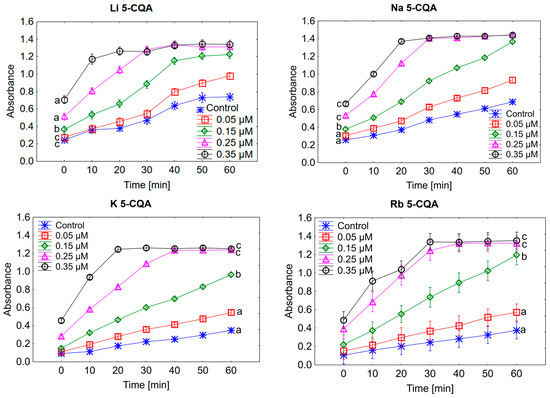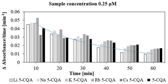 Chlorogenic acid and chlorogenates were also tested for their pro-oxidative effect on trolox oxidation. The radicals of chlorogenic acid and chlorogenates are produced in their reaction with H2O2 catalysed by horse radish peroxide. Then the phenoxyl radicals react with trolox which undergoes oxidation to trolox radicals and then trolox quinones. Whereas the phenoxyl radical are transformed to phenolic compounds. The maximum absorption for trolox quinone is 272 nm. This is a general procedure to study the pro-oxidant activity of phenolic compounds [54]. In Figure 3 the effect of 5-CQA and its alkali metal salts with different concentrations of the oxidation rate of trolox is shown. The pro-oxidant effect depends on the type of compound and its concentration. With the increase in the concentration the pro-oxidant capacity of compounds increase. For the two selected concentrations, i.e., 0.05 and 0.15 μM, the oxidation of trolox did not finish after 60 min of measurement. Whereas for the last two concentrations, i.e., 0.25 and 0.35 μM, the oxidation of trolox finished after 20–50 min depending on the type of compound. In the case of 0.25 μM the reaction came to an end after 30 min. for Li and Na 5-CQAs, 40 min. for K and Rb 5-CQAs and 50 min. for chlorogenic acid. The rate of trolox oxidatation increased with another increase in concentration, i.e., in the case of 0.35 μM solution the reaction finished after 20 min for Li, Na and K 5-CQAs, and 30 min. for Rb and Cs 5-CQAs as well as 5-CQA. This can be seen very well in Figure 3, where the effect of different concentrations (0.05–0.35 μM) of chlorogenic acid and its alkali metal salts on the oxidation of trolox was depicted. Even at 60 min of measurement of the reaction course the absorbance still increases when the tested compounds are at the 0.05 and 0.15 μM (Figure 4). The maximum pro-oxidant activity is reached at a higher concentration (in our experiment: 0.25 and 0.35 μM, Figure 5) after a maximum 50 min of measurement. Then, for both the higher concentrations (0.25 and 0.35 μM) a clear trend occurs: the pro-oxidant activity of the studied compounds increases in the series of Li⟶Na⟶K⟶Rb⟶Cs 5-CQAs⟶5-CQA (Figure 5). Besides this, the presence of the catechol moiety, the type of metal in the carboxylate group of chlorogenate is crucial for the pro-oxidative properties of tested compounds. The pro-/antioxidative activity of phenolic compounds or their alkali metal salts is sometimes correlated with the increase in their lipophilicity [59].