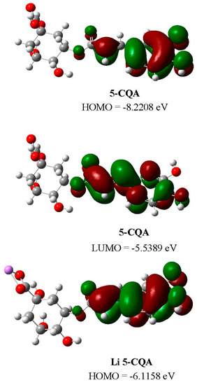 The HOMO (highest occupied molecular orbital) and LUMO (lowest unoccupied molecular orbital) orbitals calculated in gas phase 5-CQA and Li 5-CQA.