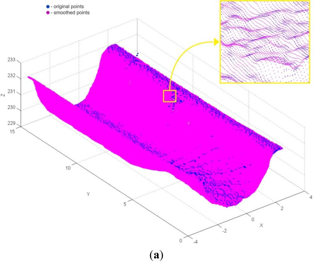 The method of median can also be used for elimination of outliers as well as for point data smoothing, while the method of mean is exclusively used for smoothing [21]. As presented in Figure 4(b), the median filter can be useful in elimination of impulse noise. In contrast to the angular filter, this filter retains the analyzed point in the array, but it changes the y-coordinate. Therefore, its use may make more sense in cases of lower density point data from geometrically more complex objects.