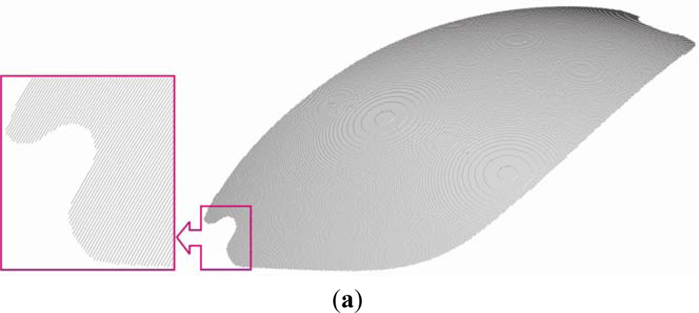 Cross-sectional filtering/smoothing of point data was performed in the next phase of pre-processing and comprised elimination of end points in two iterations—1st along the y axis, and 2nd along the x axis (due to the disposition of points it was possible to eliminate end-points along two axes). This tool was applied because of a higher probability of error-points around the object’s rims, caused by the transition of the digitization sensor probe from object to fixture and measuring table. Within the 1st iteration, along y axis, a total of 2,586 points (3 points at each end in all of the 429 cross-sections) were eliminated (Figure 23(a)). Likewise, in the 2nd iteration along x axis, a total of 2,748 points (2 points at each end in all of the 687 cross-sections) were eliminated, so the resulting point cloud contained 219,082 points (Figure 23(b)).
