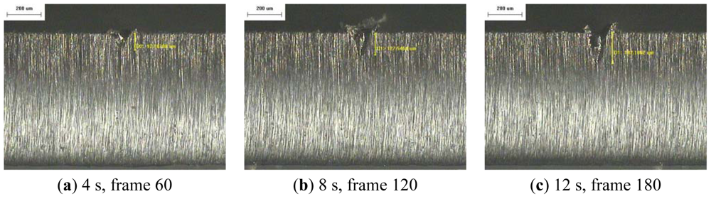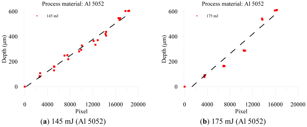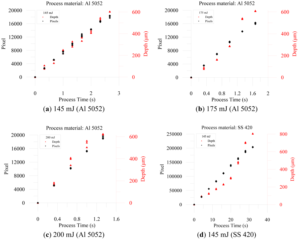The results reveal that the cumulative plasma size has high coefficient of determination (R2) of 0.984 (aluminum, 145 mJ), 0.95 (aluminum, 175 mJ), 0.983 (aluminum, 200 mJ), 0.892 (stainless steel, 145 mJ), 0.975 (stainless steel, 175 mJ), and 0.978 (stainless steel, 200 mJ) with the machining depth, respectively. The hole depth is directly proportional to the machining pulses and the sum of the pixels of all the frames of the plasma region. Based on the proportional relation, we could use the total cumulative pixel values to estimate and detect the laser-drilled hole depth. Also, higher laser energy could induce both a larger region and additional pixels of plasma. Considering the fact that the radiation energy of the laser machining also affects the machining depth, a higher energy could generate deeper holes for the same process time, as shown in Figure 12. We also found that when the laser beam struck the material surface, the higher energy induced a larger plasma region. In this study of image processing based on machine vision, we determined that the size of the laser-induced plasma region at the surface of the workpiece could be transformed into the value of the pixels. The laser energy conditions determined both the laser-drilled hole depth and size of the plasma region, along with the process time. Thus, we could analyze and obtain the total pixels of the plasma region in on-line during processing, and we achieved a on-line detection and estimation of the depth of a laser-drilled hole. However, as shown in the Figure 12, the variations in the cumulative plasma size and the drilling depth with the time were observed.