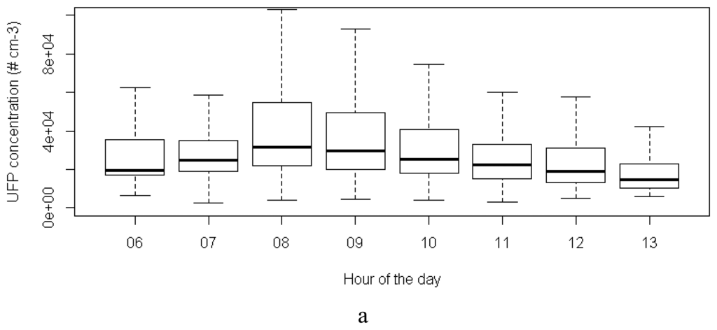 A boxplot analysis of the UFP and BC concentrations in function of the hour of the day reveals the highest concentrations during the morning rush hour (8 am) (Figure 8). The concentrations decrease steadily afterwards. A relatively high variability for all hours of the day (represented by the boxes and whiskers) results from a day-to-day variability between these hours and from short-time fluctuations of the pollutant concentrations within the hour of the day, i.e., short term fluctuations caused by fluctuations in the traffic dynamics. Source emissions in the vicinity of the Aeroflex cause dramatic peaks in the concentrations, but concentrations decline rapidly after these events.