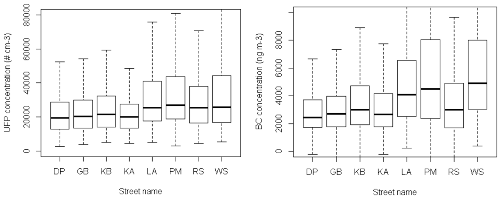 Two air pollutants were monitored in this study: ultrafine particles (UFP) and black carbon (BC). A TSI P-Trak ultrafine particle counter (model number 8,525) was used to measure the number concentration of UFP within a range from 0 to 5 × 105 particles cm−3 at a temporal resolution of 1 second. The P-Trak is based on the condensation particle counting technique using isopropyl alcohol [21]. The flow rate of the P-Trak was 0.7 L minute−1, the temperature during operation was within the limits provided by the manufacturer, and alcohol saturation of the wicks was guaranteed. BC measurements were done with a microAethalometer Model AE51 (Magee Scientific) which registers the rate of change in absorption of transmitted light due to continuous collection of aerosol deposit on filter. BC measurements were made at a temporal resolution of 1 second using a flow rate of 150 mL minute−1. Filters were changed at the start of each day. A noise reduction algorithm was performed on the BC measurements (ONA algorithm, [24]).