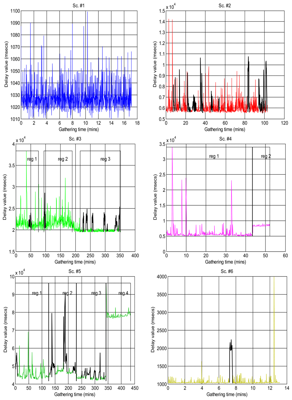 Figure 2 shows the sequences of total delays that we have measured in the sensory loop for each of the scenarios defined in Table 1, versus the time when each delay value was measured; it is easy to observe abrupt changes of regimes, outliers and bursts in those delay signals. Also, some of them exhibit smooth changes in their average, i.e., their trends vary. In that figure we have drawn thick lines for separating portions of the scenarios where we cannot detect visually relevant abrupt changes or other non-linearities (i.e., these portions are near-stationary, also called “regimes”), and marked some clear bursts. The boxplots of Figure 3 confirm the wide range of time delays measured and the pronounced skewness of their marginal distributions.