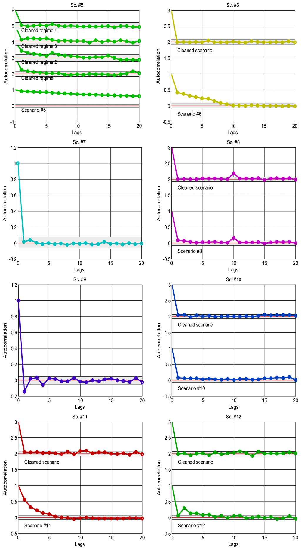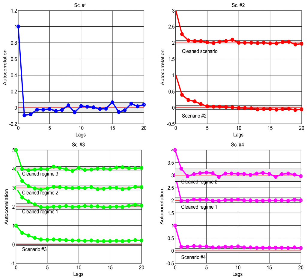 As explained in the introduction, it is a suitable approximation to assume statistical independence of sequential delay values in the stationary parts of the signal, which will allow us to apply the basic tools of the next sections and, in general, work with marginal distributions as suitable models of the data. To confirm this, we have analysed the correlation coefficients in the acquired data: the delays would be dependent if the autocorrelogram function (ACF) goes above the corresponding confidence limits; otherwise, our independence hypothesis cannot be rejected [35]. Figure 4 shows the ACFs of the scenarios, where it is clear the strong dependence of many of them when non-stationarity is not detected and handled, and also the ACF of the visually purged scenarios (eliminating the visually detected bursts and regimes marked in Figure 2). We can see how the ACF stays closer to zero in the latter, and it remains below the confidence limits in most cases. This supports our assumption of considering iid sequences of delays (independent and identically distributed) as long as they are separated in regimes and we can also detect bursts and isolated outliers. Of course, smooth variations on the underlying distribution—smooth trend changes—are still possible, but the results obtained with our abrupt detection method also applies in many cases that exhibit such trending.