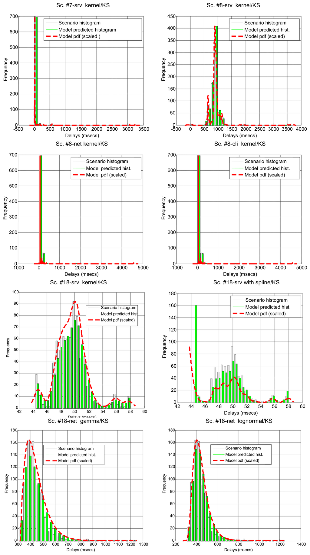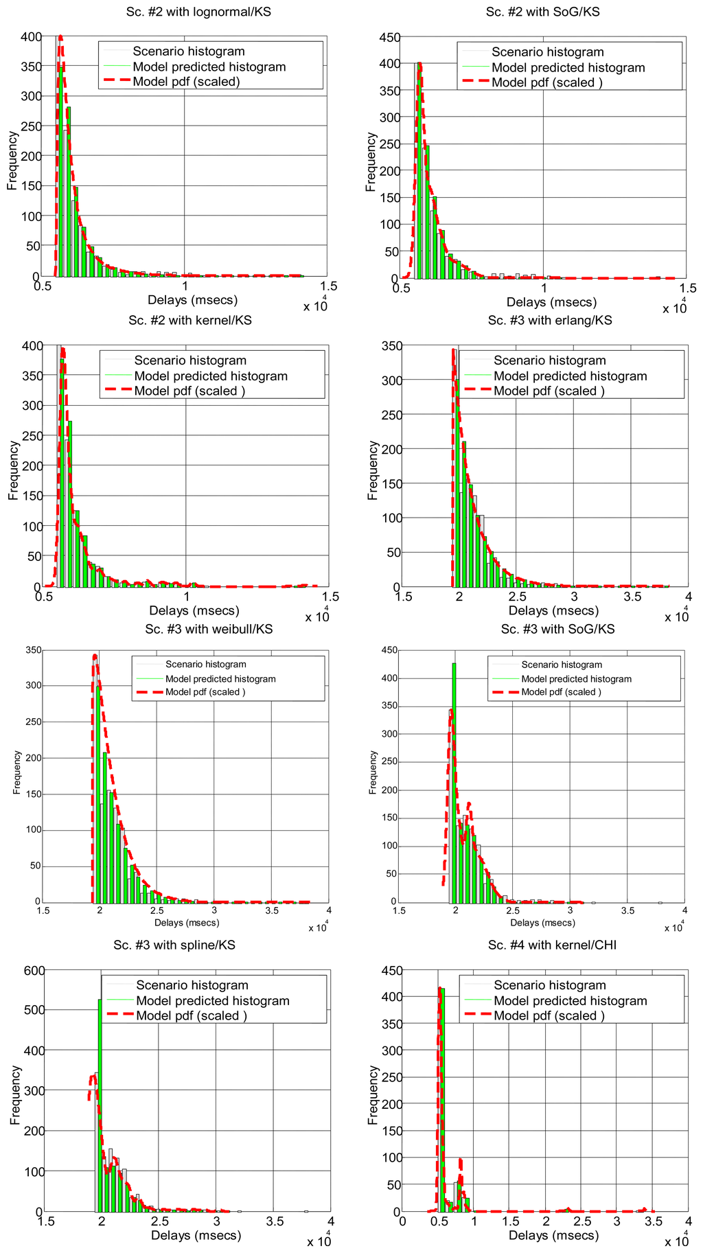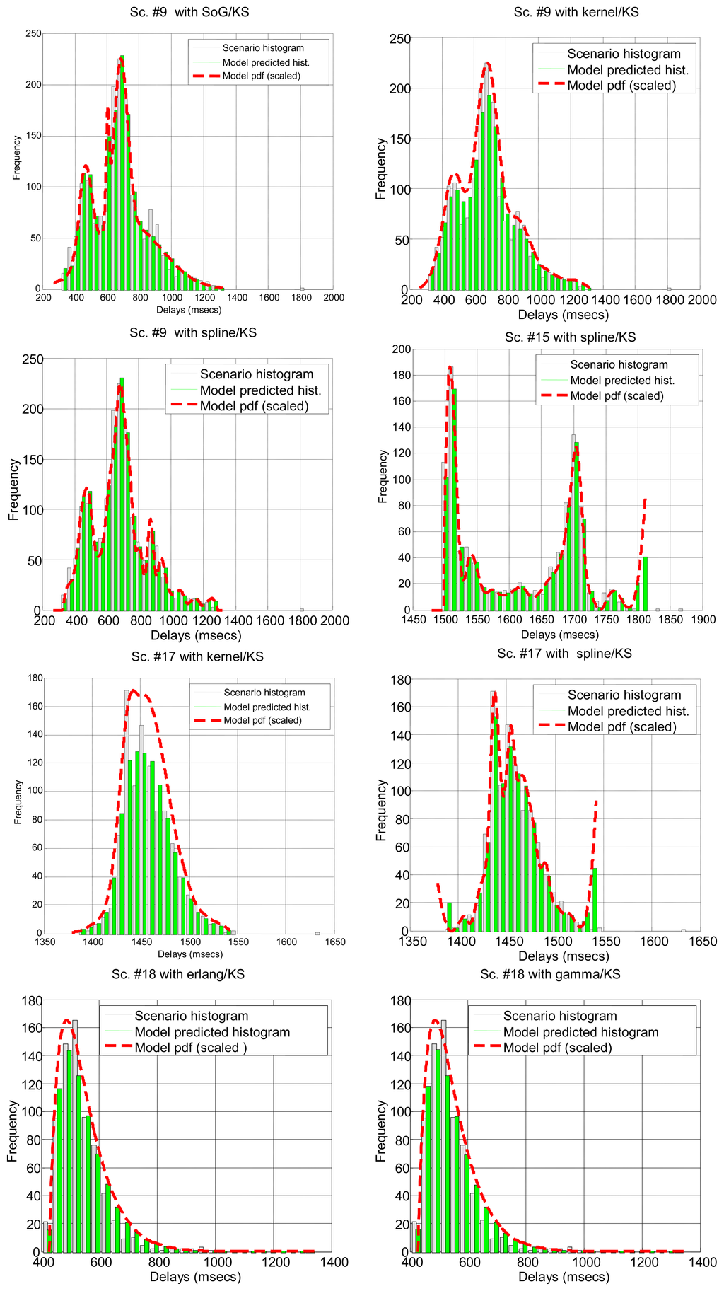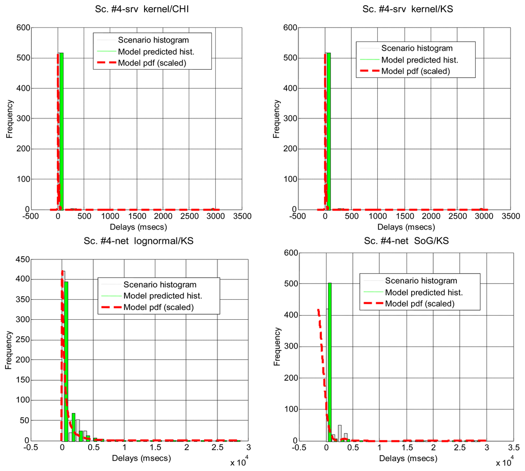 After running the significance tests, we see in Table 4 that, as expected from the multimodal nature of most scenarios, only a few of them can be explained by parametrical models: #3, #2 and #18 (corresponding to the B class and to a percentage of all delay values in all the scenarios below 12%). The rest of the scenarios do not support the null hypothesis. In the case of non-parametrical models, kernel and spline provide the best results, with above 40% of delay values explained. Non-rejected scenarios are displayed in Figure 5 for illustrative purposes. These results show that, for a parametrical choice, the lognormal or erlang distributions could be preferred when we are not able to detect outliers, bursts and regimes, but these are not good enough and might be applicable to very few scenarios. For a non-parametrical option, the kernel distribution should be the best election. In general non-parametrical models are able to explain scenarios from all classes (A, B, C), given their closest fitting to the particular data in the sample (which leads, on the other hand, to the previously mentioned problem of overfitting). The SoG model obtains worse results than the kernel due to its restriction in the number of modes, while the spline is also worse than the kernel due to its greater overfitting, that produces very good models of the data used for fitting but not in its goodness-of-fit with the delays reserved for hypothesis testing.