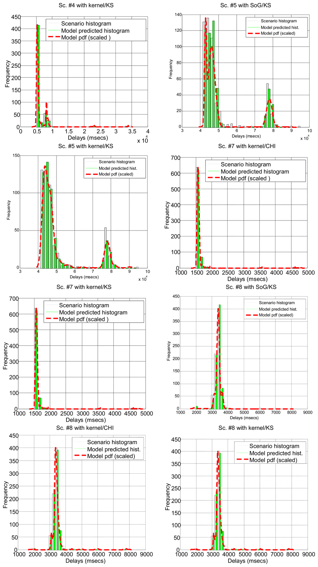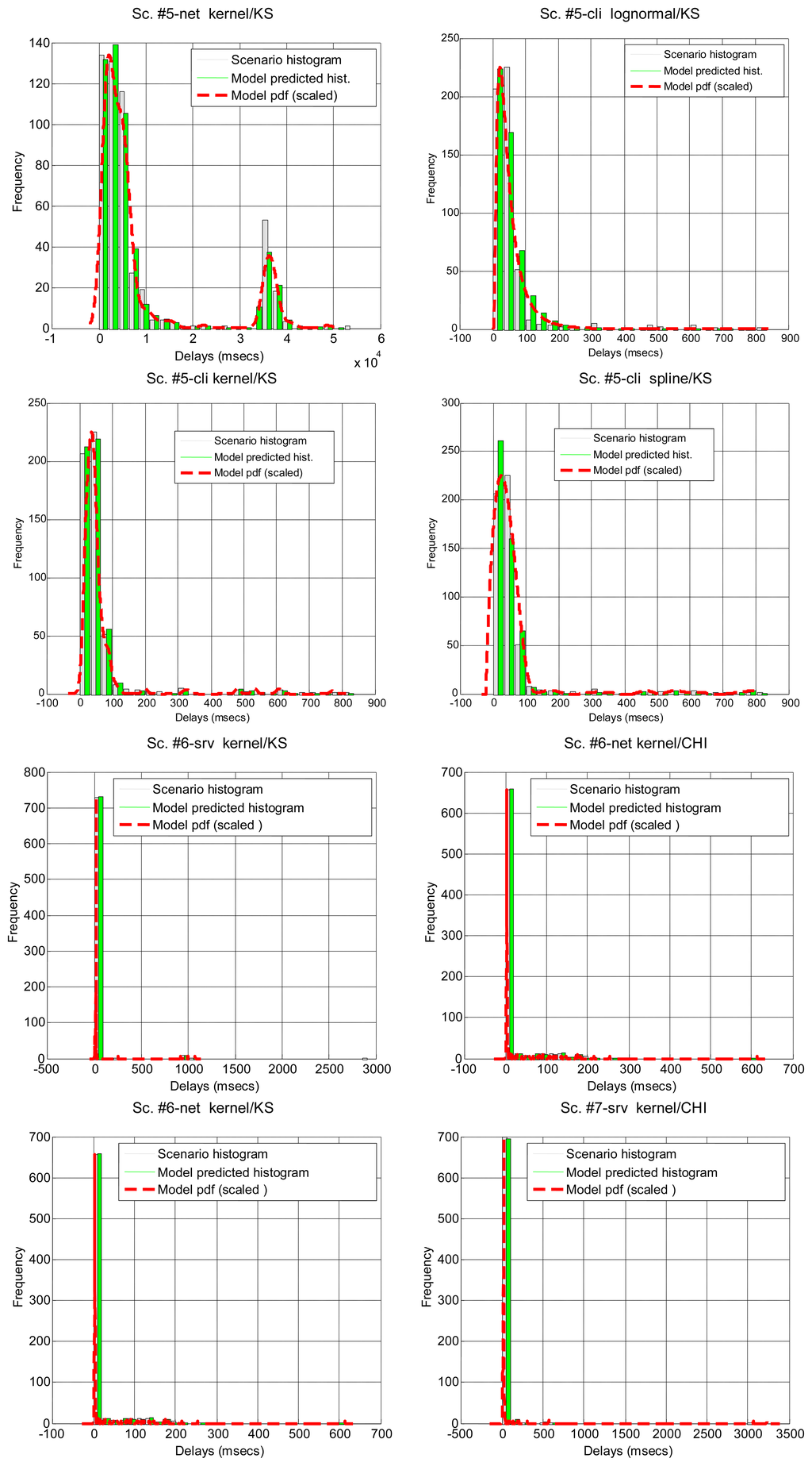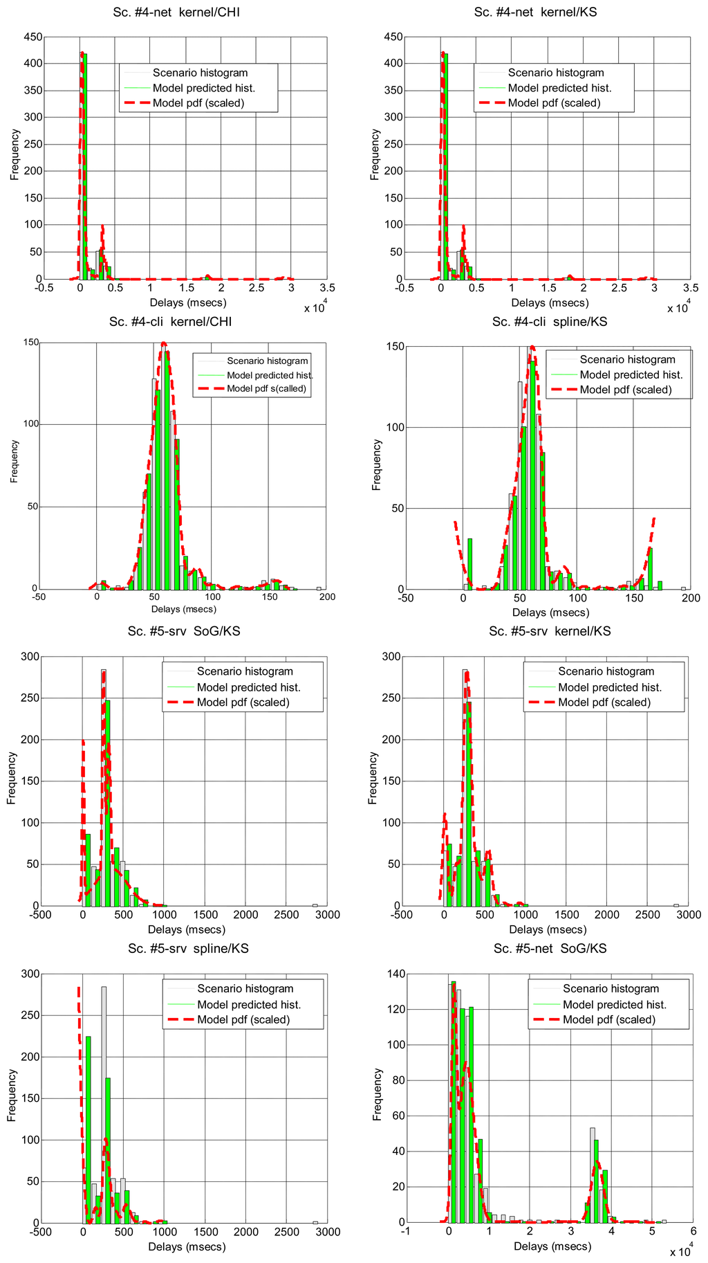 After running the significance tests, we see in Table 4 that, as expected from the multimodal nature of most scenarios, only a few of them can be explained by parametrical models: #3, #2 and #18 (corresponding to the B class and to a percentage of all delay values in all the scenarios below 12%). The rest of the scenarios do not support the null hypothesis. In the case of non-parametrical models, kernel and spline provide the best results, with above 40% of delay values explained. Non-rejected scenarios are displayed in Figure 5 for illustrative purposes. These results show that, for a parametrical choice, the lognormal or erlang distributions could be preferred when we are not able to detect outliers, bursts and regimes, but these are not good enough and might be applicable to very few scenarios. For a non-parametrical option, the kernel distribution should be the best election. In general non-parametrical models are able to explain scenarios from all classes (A, B, C), given their closest fitting to the particular data in the sample (which leads, on the other hand, to the previously mentioned problem of overfitting). The SoG model obtains worse results than the kernel due to its restriction in the number of modes, while the spline is also worse than the kernel due to its greater overfitting, that produces very good models of the data used for fitting but not in its goodness-of-fit with the delays reserved for hypothesis testing.