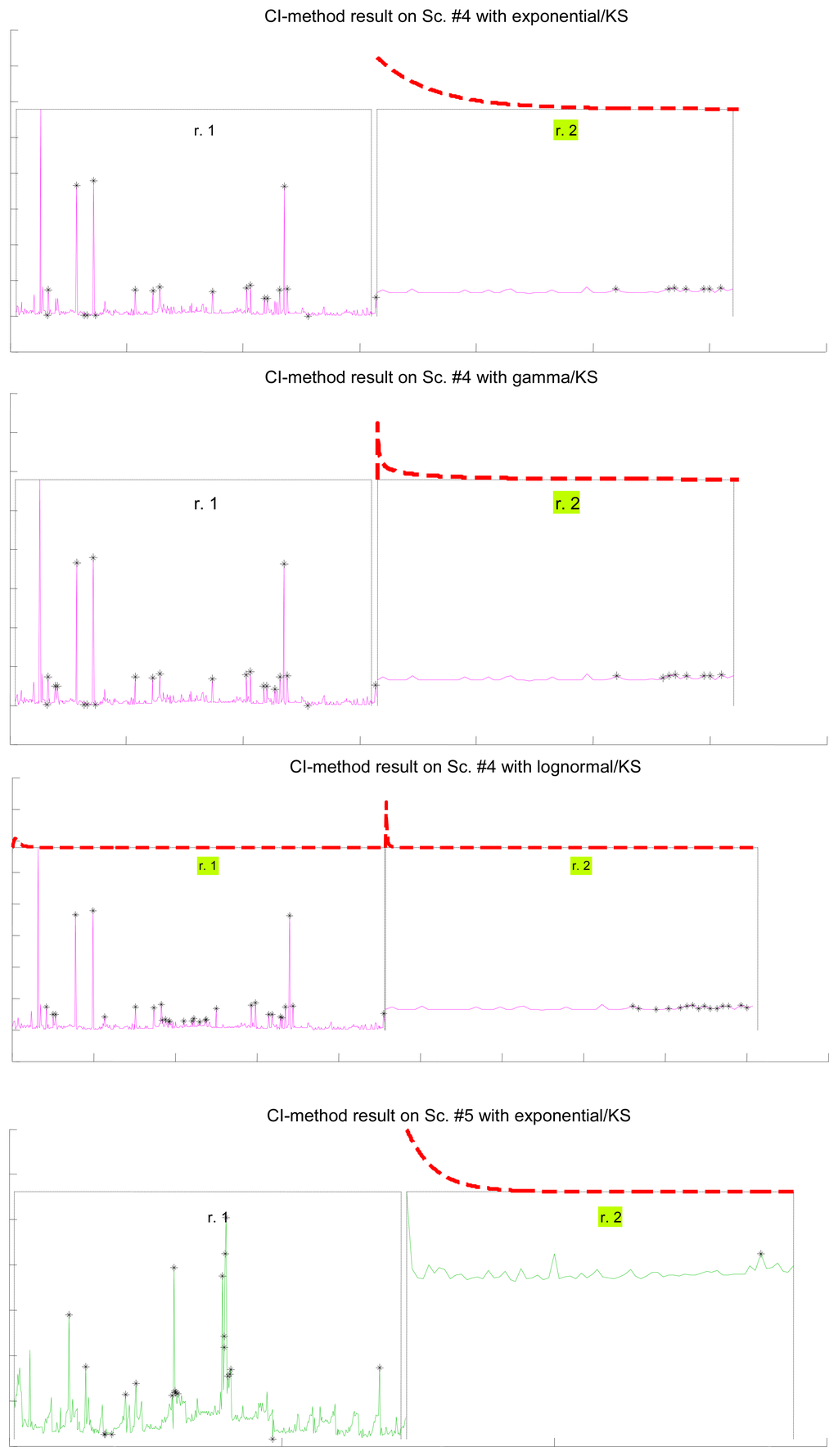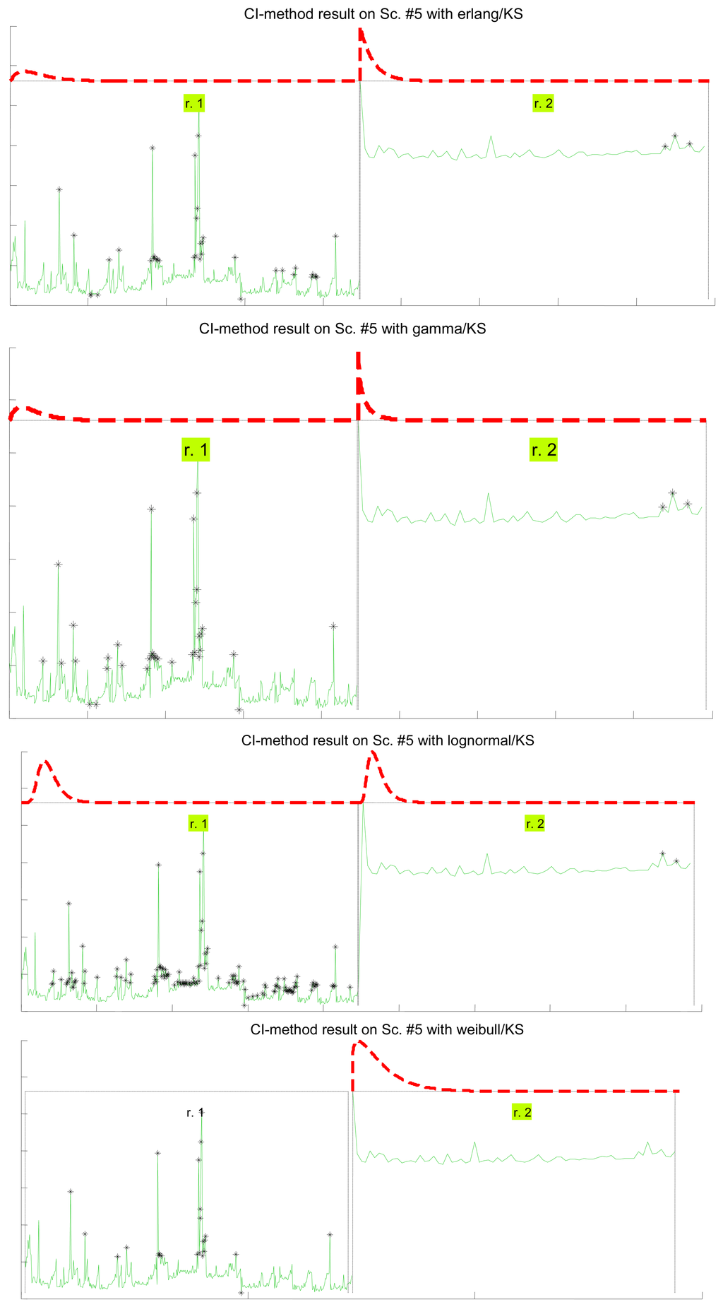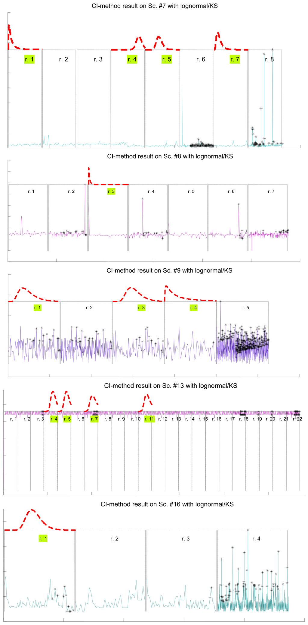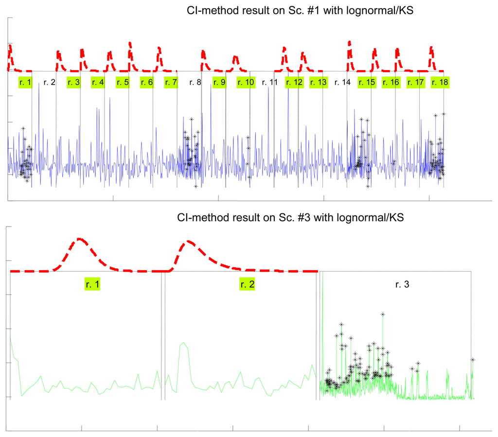 Figure 7 illustrates the results for the scenarios that have been modeled successfully. On the top plot of each figure we have drawn the models found for the different segments (regimes) that have been separated by the confidence interval method. Bursts and outliers are marked with black asterisks.