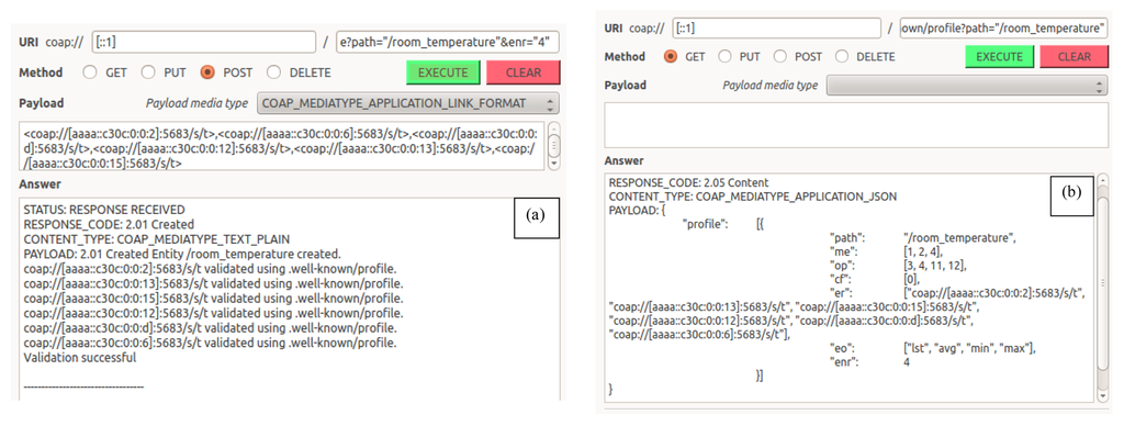 Resource profiles can be used to express capabilities of a CoAP server and its resources []. Profiles are usually expressed in JSON format []. To briefly illustrate resource profiles, let us assume that in Figure 7 the temperature sensor at “coap://[sen5]/tmp” supports the “Uri-Host” (3), “ETag” (4), “Observe” (6), “Uri-Port” (7), “Uri-Path” (11) and “Content-Format” (12) CoAP options (op). This sensor further supports the “application/json” (50) content format (cf) and the allowed method (m) is GET (1). This will result in sen5 having the following profile: