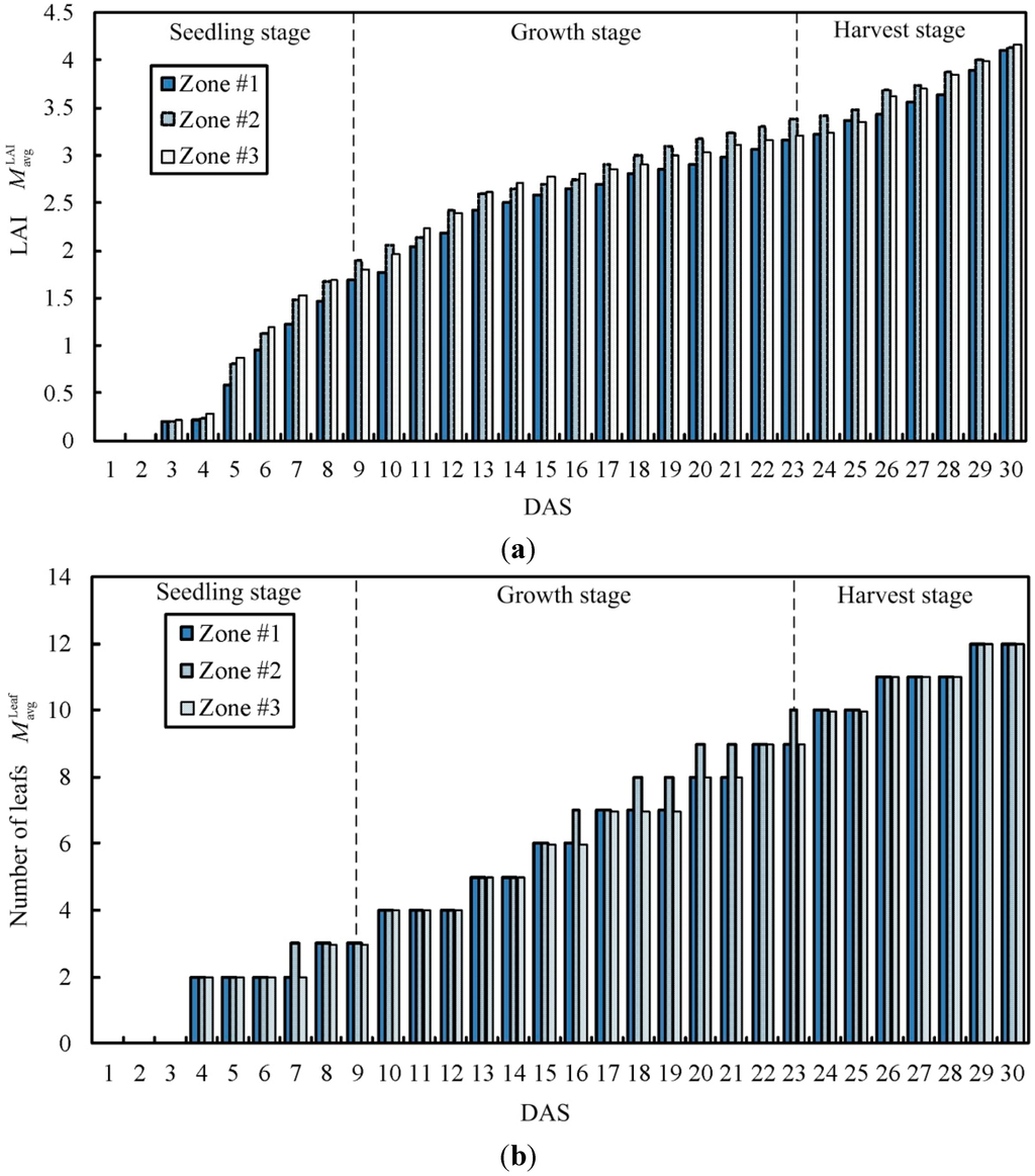 In this experiment, the lettuce is cultivated in Zone #1, Zone #2, Zone #3, and the uncontrolled zone within the greenhouse. The initial environment parameters of each zone are different. The crop harvest was performed at 30 days after sowing (DAS). In this cultivation experiment, the temperature and humidity values are regulated based on the growth response of plant. The preset temperature and humidity is set as 20 °C and 80% for each zone (n = 1, 2, 3), respectively. The average CO2 concentration is 600 ± 75 ppm and the average photo flux is between 85 and 210 in the greenhouse. This is equivalent to the average daily light integral (DLI) from 3.6 to 9.07 . Figure 12 and Figure 13 show the changes in the temperature and humidity during plant growth, and show the changes of temperature and humidity outside the greenhouse, where the dotted line represents the switching time point of the plant growth stage. During 9 DAS to 10 DAS, the lettuce cultivated in various zones turned from the seedling stage into the growth stage. During day 22 to day 23, the lettuce in various zones has gone from the growth stage to the harvest stage. Due to the change of temperature outside the greenhouse, the temperature inside the greenhouse changes as well. However, the temperature change is still within the desired control range.