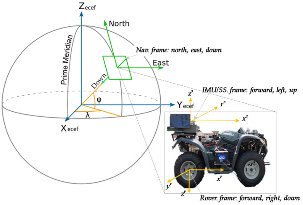 Keeping track of attitude is important to ensure accurate localization; heading accuracy is especially effective at reducing cross track errors and hence enhances the accuracy of overall localization []. Although gyroscopes can be used for such purpose, attitude propagation using only gyros requires mathematical integration of the angular rate signals obtained from the sensor. This causes the noise in the gyro signal to be integrated as well, along with the actual angular rate signal. Moreover, the gyro bias drift will contribute to calculated attitude divergence with time propagation. This is the inherent limitation of gyro-only attitude estimation, and occurs no matter how accurate and expensive a gyro sensor is used. To address this task, first we have to define the different coordinate frames which are used to represent navigation information in this work.
