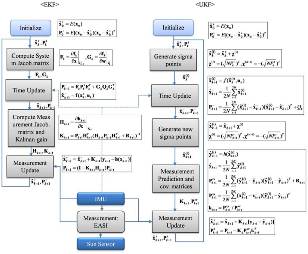 After this step, the measurement update in UKF takes a form similar to EKF, Equation (17). The whole process flowchart along with the corresponding equations for both nonlinear filters is given in Figure 6.