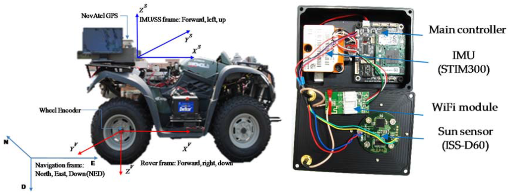 A position sensitive detector (PSD) type Sun sensor, similar to ours, has been used in []. The PSD type Sun sensor uses less power and simple algorithm to detect the Sun’s position in the sensor frame, and suffers less atmospheric effects and is quite robust. The authors also provided an algorithm for estimating absolute heading and absolute position using the Sun sensor and an inclinometer, employing the q-Method. The accuracy of position estimation was quite coarse. They achieved absolute heading angle within a few degrees but used a nonlinear minimization approach, which requires much more time as compared to our approach. Furthermore, the optimization based methods can only be employed in a static condition [], and requires the vehicle to stop for few minutes [] during the collection of the sensor’s multiple observations. In contrast, our approach is a one-shot heading estimation method, called Estimation of absolute Attitude using Sun sensor and Inclinometer (EASI), and can be performed in real time at 10 Hz (determined by the Sun sensor’s update rate), using the Sun sensor and inclinometer data only.