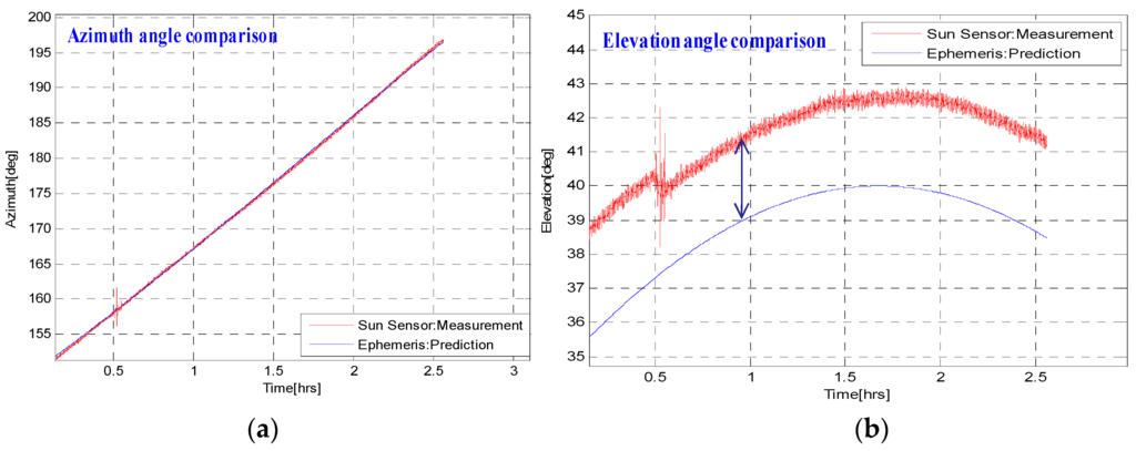 Optimization based heading estimation is another method for estimating absolute roll, pitch and heading angles based on multiple Sun observations and gravity vector observations. It uses at least a pair of Sun and gravity vectors and applies optimization techniques to minimize the cost function. However, in practice many observations must be collected from both sensors before applying optimization technique. The result is a transformation matrix between two observation frames, in this case, the Planet-centered Planet-fixed frame (F-frame) and the Sun sensor frame (S-frame). Using this approach, as explained in [,] we obtain prediction vectors, namely the Sun position and gravity vector, in the F-frame from the Sun ephemeris data, and from the gravity model, respectively, as in Equation (7):
