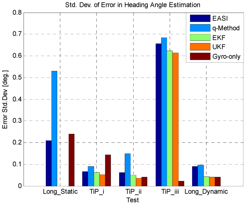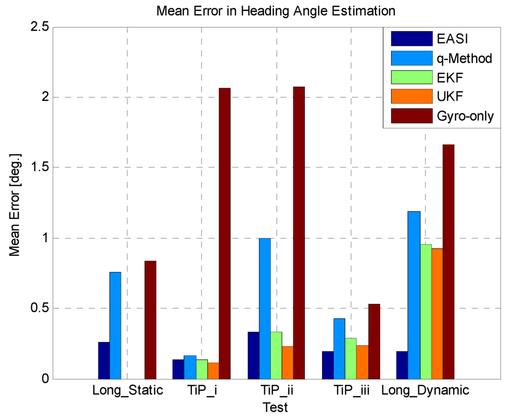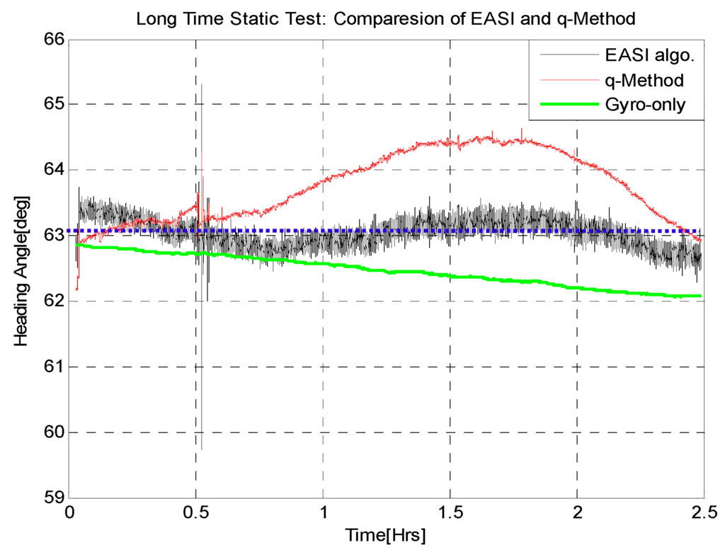 The comparison of EASI and q-Method shows that in the static condition, both absolute heading estimation algorithms work well as expected, but in the dynamic case, the q-Method fails to estimate heading reliably, whereas the EASI has good performance both in the static and in the dynamic situation too. The reason is that EASI is a one-shot algorithm whereas the q-Method requires the collection of a number of measurements before applying some kind of optimization method.