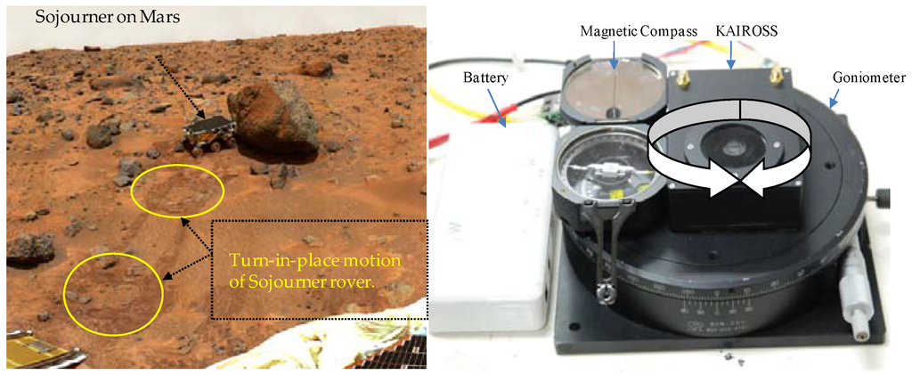 Relative (local) navigation information can be obtained in a way similar to that used for terrestrial ground vehicles, e.g., through integration of angular rates to get attitude and displacement from wheel encoders []. However, absolute (global) navigation information, which provides the navigational information of a vehicle directly in global coordinates and does not diverge with the passage of time, is difficult to obtain on a planetary surface. Another reason that absolute navigational information is needed in the navigating framework of a planetary rover is to limit the unbounded error growth of a dead reckoning positioning system. Absolute heading is especially essential to reduce cross track errors in mobile robots [].
