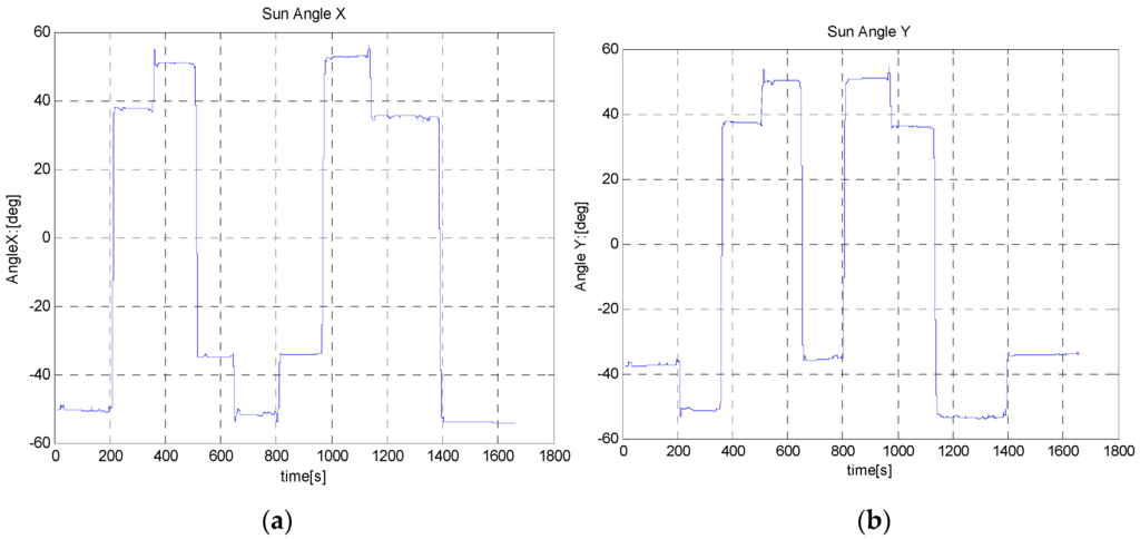 Sun sensor output during Test (B-i) with 90° rotation steps in the CW and CCW directions. (a) Angle-x is the angle between z-axis and projection of Sun ray on x-z plan; (b) Angle-y is the angle between z-axis and projection of Sun ray on y-z plan.