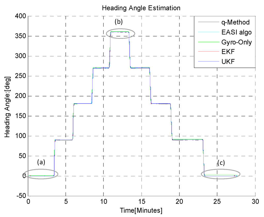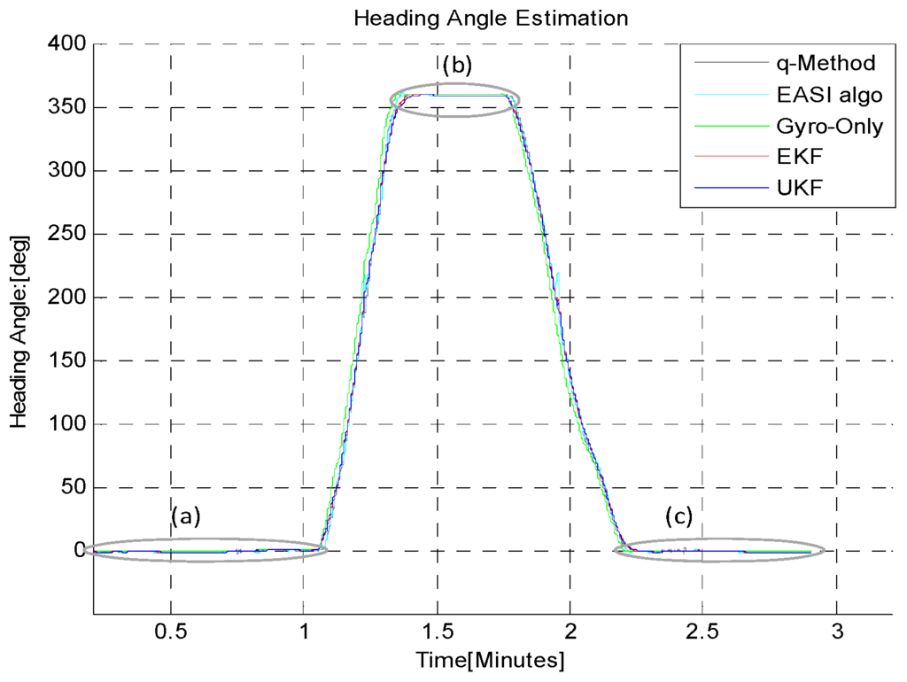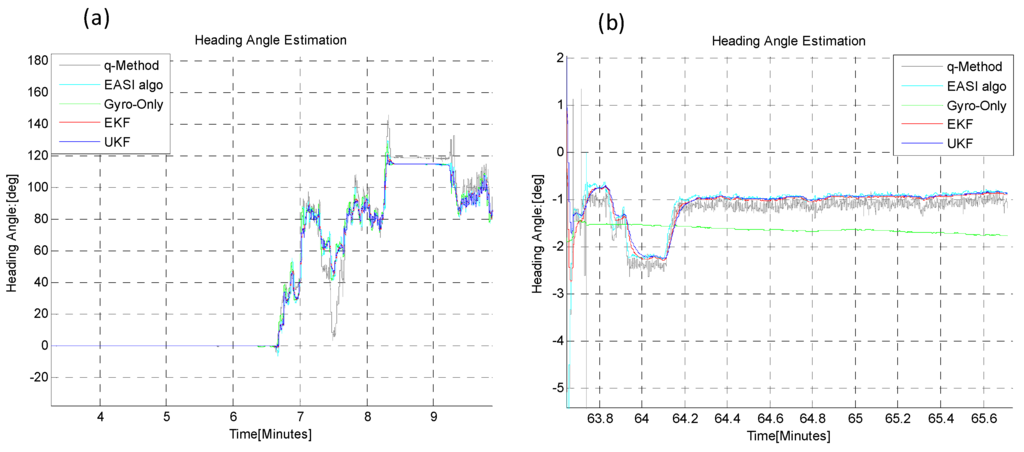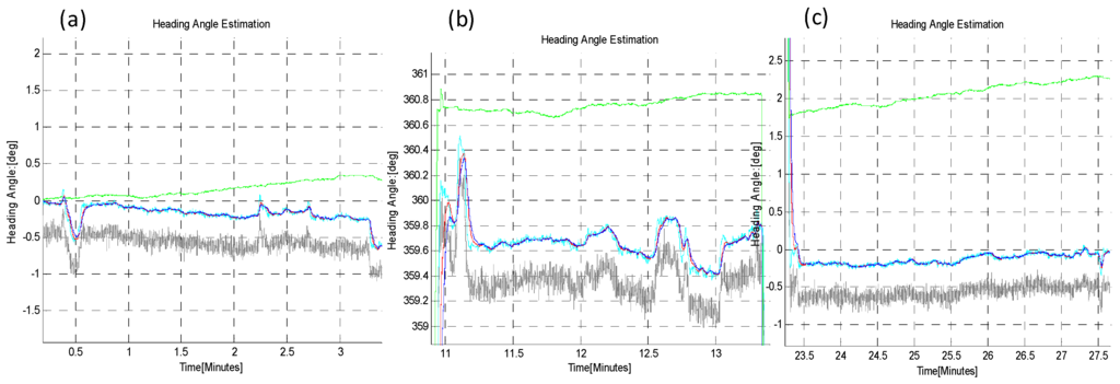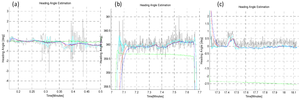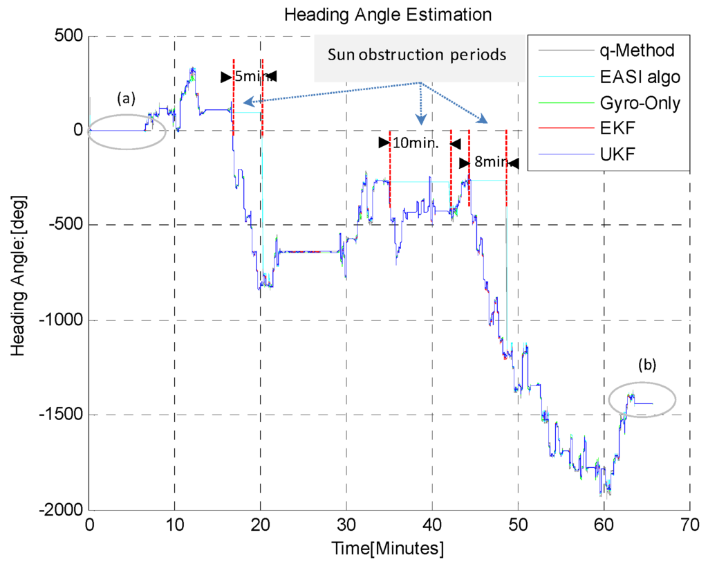 The estimated heading angle provided by different algorithms is given in Figure 21. There were Sun obstructions periods of different time durations during this long-time dynamic test, in order to check the capability of the estimators, EKF/UKF during Sun obstruction periods.
