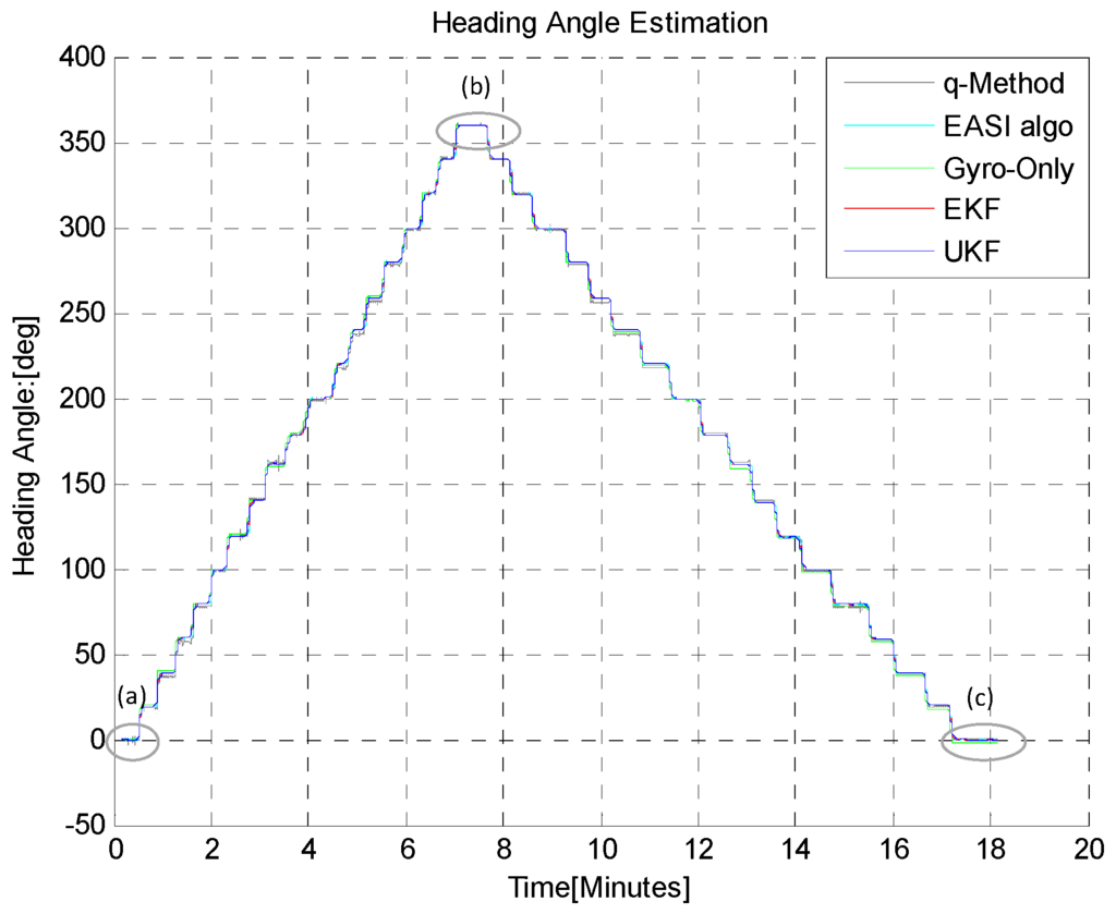 In the second TiP test (B-ii), the sensor plate was rotated in short steps of 20°, to ensure that the developed algorithms can also reliably track small changes in absolute heading angle, while performing the turn-in-place rotation, as shown in Figure 15 and Figure 16. The zoom-in view (a,b,c) and statistical comparison are shown in Figure 16 and in Table 4. The q-Method has a large mean error and standard deviation as compared to the EASI algorithm. The q-Method does not track heading angle well in this quasi-dynamic test due to the dynamic motion, because it needs multiple measurements from the same position to perform an optimization operation.