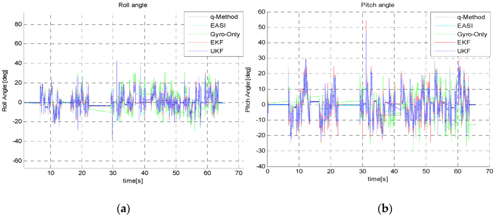 (a) Roll angle and (b) pitch angle estimation during the long dynamic test.