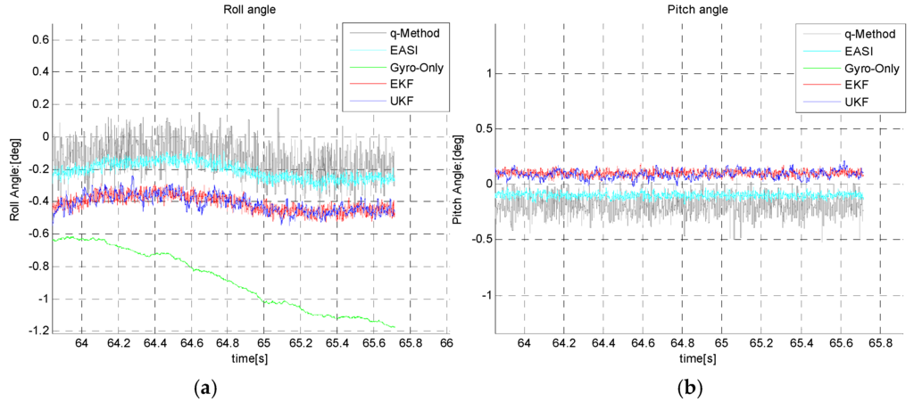 End trajectory Roll angle (a) and pitch angle (b) estimation during long time dynamic test.