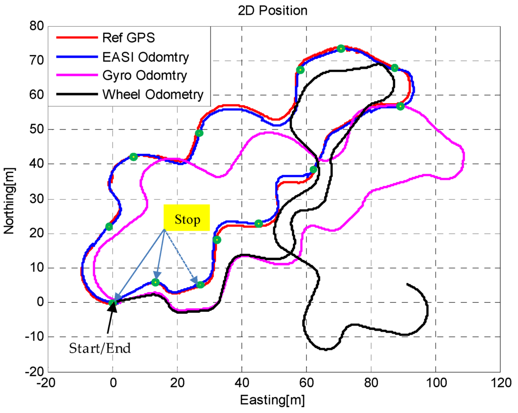 In this work we have calculated the rover position using the traditional wheel-odometry method, gyro-odometry and by combining the wheel encoder data and the output of the EASI algorithm, called EASI-odometry. However, even if we provide accurate attitude estimates, the position error will grow due to errors in the dead reckoning process when using wheel encoder data to get change in position, as given in Equations (20) and (21),