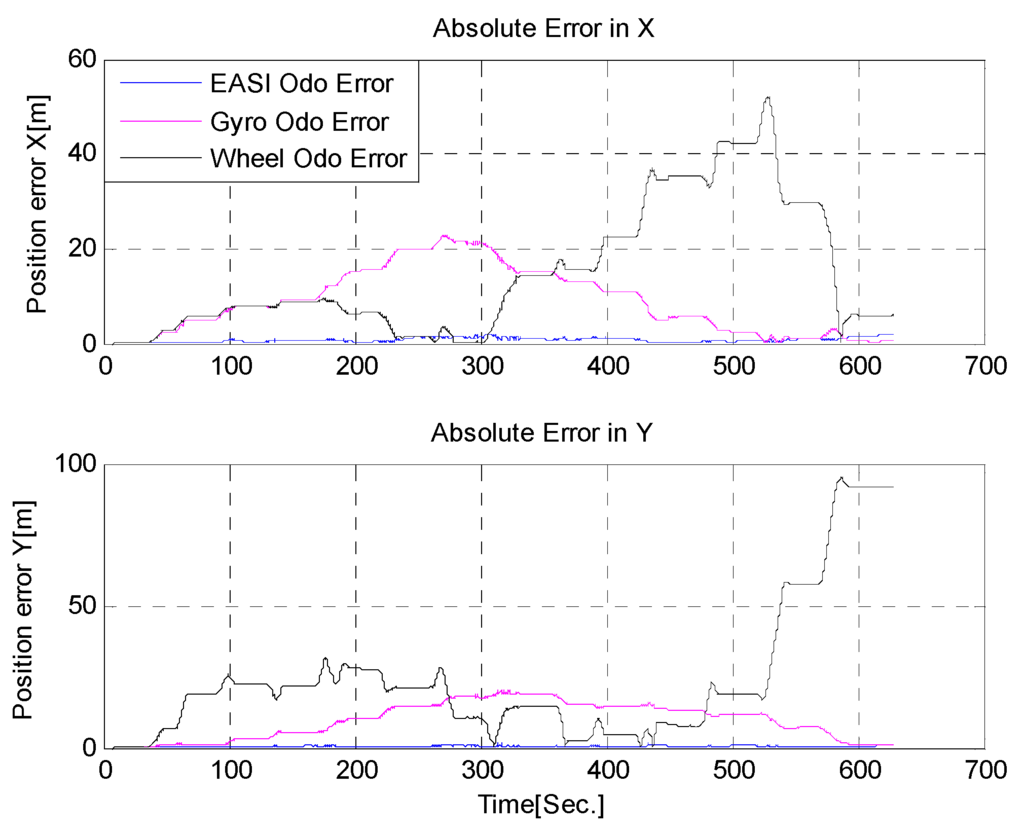 The quantitative comparison of position estimates shows that the position errors of the EASI-odometry were less than 3m when compared with a NovAtel GPS module in this 10 min and about 200 m run.
