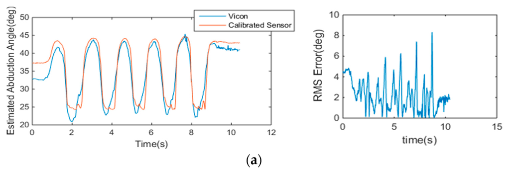 Representative results for response of the calibrated sensor with respect to the CMC-joint angles: (a) CMC-joint abduction angle estimated with Vicon and with the calibrated abduction sensor (left) and the RMSE of the calibrated abduction sensor with respect to the Vicon results (right); (b) CMC-joint flexion angle estimated with Vicon and with the calibrated abduction sensor (left) and the RMSE of the calibrated flexion sensor respect to the Vicon results (right).