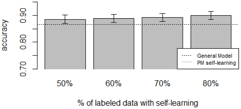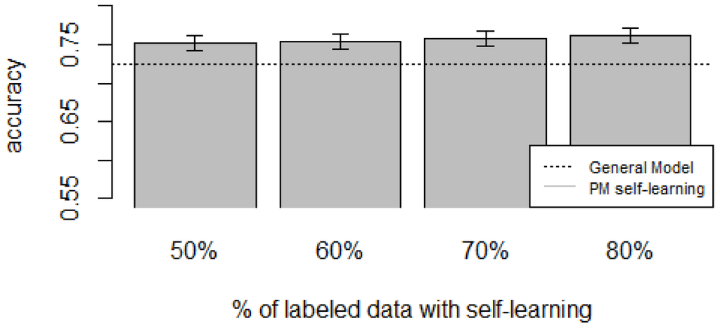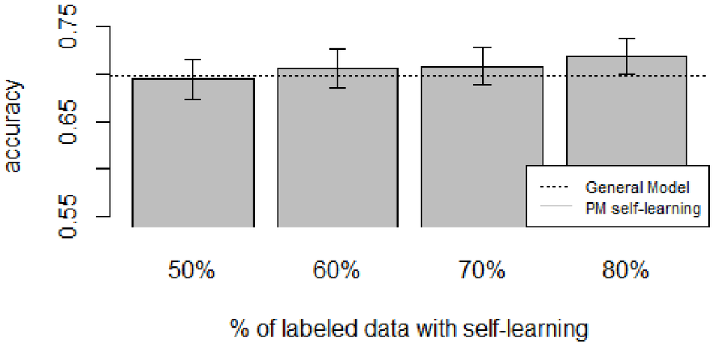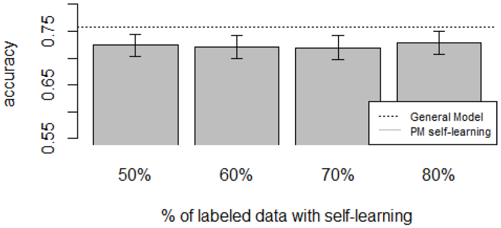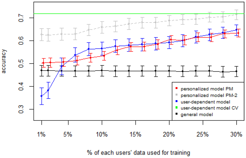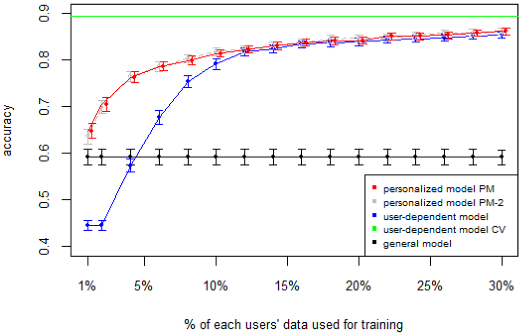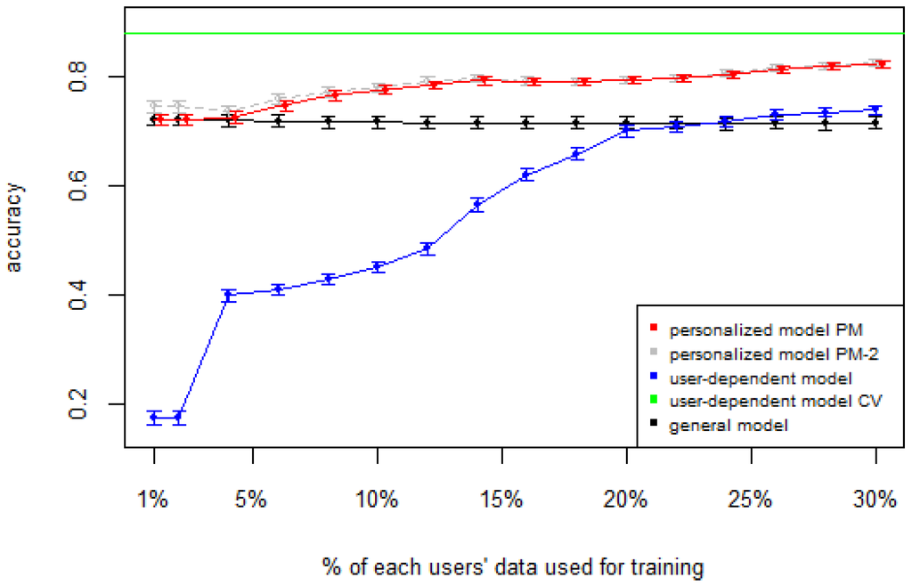 Based on our results, the proposed Personalized Model performed better than the General Model and the User-Dependent Model when there was a scarce amount of labeled data. For the case when there was no labeled data at all, the proposed approach performed better (compared to the General Model) in three (D2, D3, D4) of the five datasets, and the increment in performance was significant in two (D3, D4) of those three datasets. For D1, there was neither a noticeable increase nor decrease in performance. D5 had a statistically significant decrease in performance with respect to the General Model. Another thing to note is that for the zero-labeling case, much more training data was required to outperform the GM compared to the case when some labeled instances were available. For example, in dataset D3 when there was no labeling, the PM + Self-learning required 50% of automatically-generated training data to achieve an accuracy of 0.75, whereas the PM when there was just 15% of true labeled data achieved an accuracy close to 0.80. As mentioned before, this behavior is expected because the self-learning process will inevitably mis-classify some of the instances, and thus the automatically-generated ground truth will contain some errors.