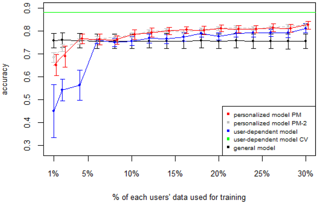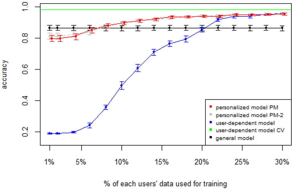 Figure 1, Figure 2, Figure 3, Figure 4 and Figure 5 show the results of averaging the accuracy of all users for each p percent of data used as train set (with 95% confidence interval bars). For comparison, the figures also show the optimal case user-dependent model CV (Cross Validated) represented by the green line which assumes there is plenty of labeled data. This was obtained by performing 10-fold cross validation for each user independently. With this scheme, every iteration assumes 90% of the data is labeled and the other 10% is used to test the model, which is a common way of validation in the literature on Human Activity Recognition. For D1 (Figure 1), the PM clearly outperforms the other two models when the labeled data is between 1% and 10% (the curve for PM-2 will be explained soon). The GM shows a stable accuracy since it is independent of the user. For the rest of the datasets, the PM shows an overall higher accuracy except for D2 (later we will analyze why this happened). As expected, for all datasets the user-dependent model CV performed much better than all other models because it is built with a lot of labeled data for each specific user.