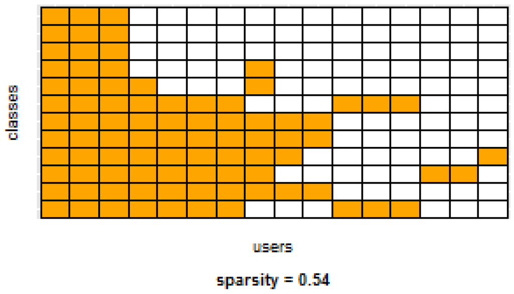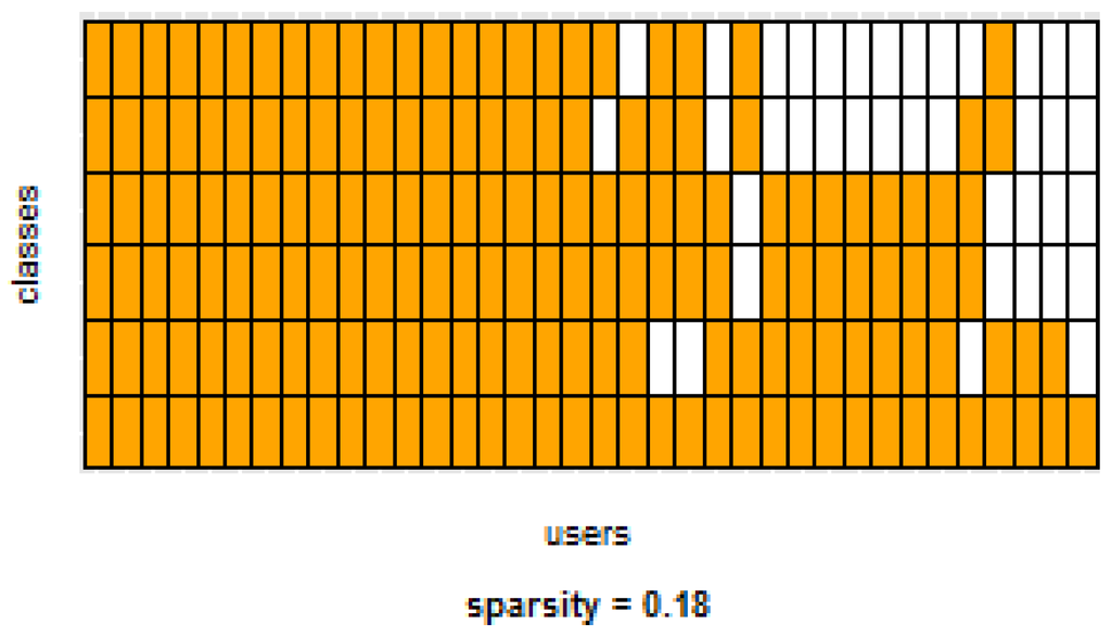 Table 3 and Table 4 show the difference of average overall accuracy and recall (from 1% to 30% of labeled data) between the PM and the other two models. Here we can see how the PM significantly outperforms the other two models in all datasets, except for the accuracy in D2 when comparing PM to UDM, in which case the difference is negligible. This may be due to the user-class sparsity of the dataset—i.e., some users performed only a small subset of the activities. This situation will introduce noise to the PM. In the extreme case when a user has just one type of activity it would be sufficient to always predict that activity. However, the PM is trained with the entire set of possible labels from all other users, in which case the model will predict labels that are not part of that user. To confirm this, we visualized and quantified the user-class sparsity of the datasets and performed further experiments. First we computed the user-class sparsity matrices for each dataset. These matrices are generated by plotting what activities were performed by each user. A cell in the matrix is set to 1 if a user performed an activity and 0 otherwise. The sparsity index is computed as 1 minus the proportion of 1’s in the matrix. For datasets D1, D4, and D5, all users performed all activities, giving a sparsity index of 0. Figure 6 and Figure 7 show the user-class sparsity matrices of datasets D2 and D3, respectively. D2 has a sparsity index of , whereas for D3 it is . For D2, this index is very high (almost half of the entries in the matrix are 0); furthermore, the number of classes for this dataset is also high (12). From the matrix we can see that several users performed just a small number of activities (in some cases just one or two activities). One way to deal with this situation is to train the model excluding activities from other users that were not performed by the target user. Figure 1, Figure 2, Figure 3, Figure 4 and Figure 5 (gray dotted line PM-2) show the results of excluding types of activities that are not in . As expected, for datasets with low or no sparsity, the results are almost the same (with small variations due to random initial k-means centroids). For D2 (which has a high sparsity) the accuracy significantly increased. This shows evidence that the user-class distribution of the dataset has an impact on the PM and that this can be alleviated by excluding the classes that are not relevant for a particular user.
