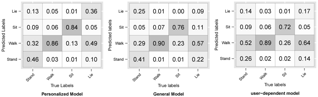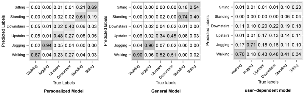 Figure 8 and Figure 9 show the resulting confusion matrices for datasets D3 and D5. The anti-diagonal represents the recall of each individual activity. For both datasets, the recall of the general model is skewed towards the walking activity, which is also the most common. For the personalized and user-dependent model, the recall is more uniformly distributed (the anti-diagonal is more distinguishable). This behaviour was observed for the rest of the datasets.