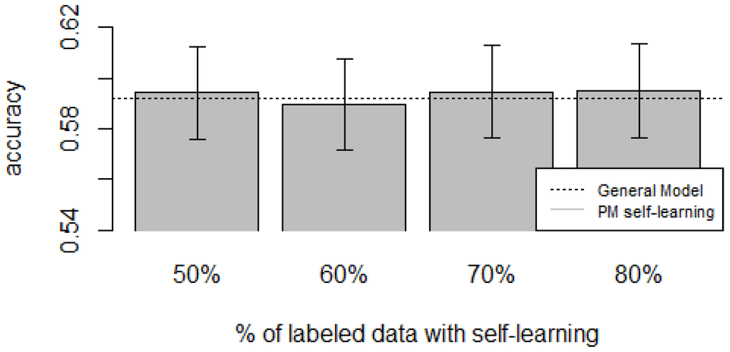 Figure 10, Figure 11, Figure 12, Figure 13 and Figure 14 show the obtained results. Overall, we can see that the Personalized Model when using self-training in the case of zero-labeling is better than the General Model (except for D5, which was worse). Furthermore, as the percentage p of instances used as training set increases, the accuracy does as well. Table 6, Table 7, Table 8, Table 9 and Table 10 show the same information in tabular form, with the last column being the difference in accuracy between the PM with self-learning and the General Model. From these tables, we can see that for dataset D1 the difference of the PM with respect to the GM is not considerable, and there is even a small decrease when using 60% of training data. For the rest of the datasets, the differences are more noticeable, ranging from ≈1%–3.8%. It seems that the greatest increments with respect to the GM were in datasets D3 and D4, which are the ones with more users. However, more experiments are required to validate this. With respect to datasets D1 and D2, there were no statistically significant differences (). For D3, the difference in accuracy became statistically significant when using 60% or more training data. For D4, the increment was statistically significant when using 50% or more of the data. In the case of D5, the Personalized Model performed worse than the General Model. This may be due to the small number of users in this dataset, and thus a lack of diversity—which can limit the prediction accuracy of the self-learning phase. If the initial predictions are not accurate, these errors can propagate to the subsequent training phase, giving a deterioration in performance as a result []. A possible solution to this problem is to use more robust self-labeled algorithms [] such as multi-view learning [].