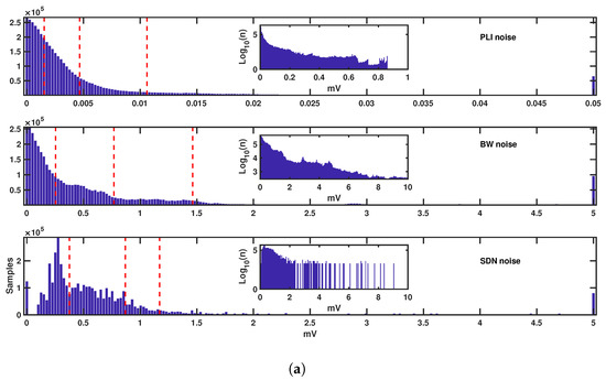 The threshold divisions, as well as the histograms of each kind of noise, are shown in Figure 4. In order to set the threshold values, only the EER histograms were used, because these provided us with a wider view of the noise, as the records came from different patients and covered very different situations related to noise. We note that the horizontal axis has a much lower magnitude in the PLI noise, as far as that its amplitude is in general much lesser than that of BW and SDN noise. However, in all of these, the distributions are shown to be mostly exponential-like (PLI and BW noise) and with heavy tails, although SDN is slightly different and centered. The thresholds were chosen on the histogram regions, aiming to separate the low-amplitude region (close to zero amplitude), the heavy-tail region (large amplitude values), and different trends in the distribution mass morphology to separate low from medium regions.