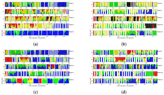 The visualization of noise maps in long recordings can be operatively limited; hence, we also introduced the use of noise bars, as seen in the example in Figure 5. Noise bars were obtained by aggregating the durations of the same types of noise in fixed-duration segments, known as time bars, and then normalizing these in each time bar. We note that the time bar was 30 s in length for EER patients. Thus, a vertical bar stands for one single time segment, which shows the ratio of each kind of noise present throughout that time period. The same color code is used so that the lower (upper) part of the bar conveys the lower (harder) noise levels. This provides a profile view, giving a good idea of how clean or noisy a recording is and how many and which clinical parameters are possible to measure through it. Different time segments are separated by a blank bar for the case of EER when stored segments are not continuous in time.