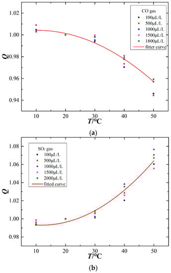 To further study the relationship between the temperature and IR absorbance of CO and SO2, the temperature compensation curves are fit by a quadratic fitting method, as shown in Figure 13c,d. The x-axis represents the ambient temperature (°C), and the Q of the y-axis represents the ratio of absorbance values at the measurement temperature and at 20 °C.
