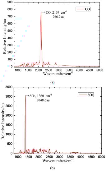 The experimental results show that the IR spectra of CO, SO2 and H2S all contain prominent peaks. The relative intensity of CO is 766.2 au at the 2169 cm−1 characteristic peak, that of SO2 is 3048.6 au at the 1360 cm−1 characteristic peak, and that of H2S is 106.4 au at the 2625 cm−1 characteristic peak. The basic rules of characteristic IR line selection are as follows: (1) the characteristic IR line is typical for a single component in the mixture; (2) a higher peak is correlated with improved detection sensitivity; (3) the lines are independent of each other to reduce cross interference; and (4) the line is only minimally influenced by external factors []. According to the above rules, the IR characteristic spectroscopy of the three target gases (CO, SO2 and H2S) is obtained by comparing the calculated and measured IR spectroscopic results, as shown in Table 4.