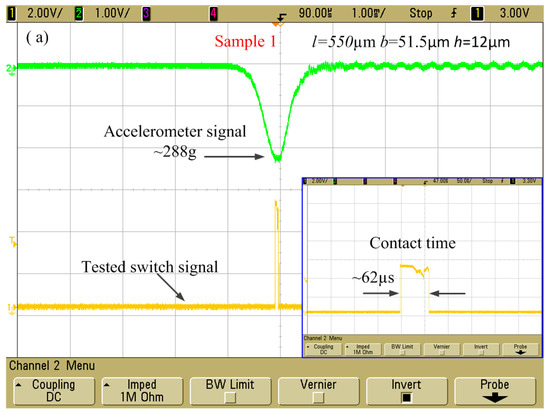 Test results of the inertial microswitches under the shock acceleration amplitude of 288 g: (a) The geometric parameters (l, b, h) of the stationary electrode are 550 µm, 51.5 µm, and 12 µm in sample 1; (b) The geometric parameters (l, b, h) of the stationary electrode are 550 µm, 51.5 µm, and 8 µm in sample 2.
