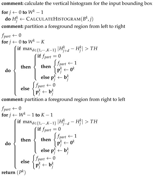 For the calculation of a partitioned bounding box from an input bounding box, a foreground partitioning algorithm in a bounding box is proposed and is described in Algorithm 1. In the algorithm description, , , and represent the width, the zero column vector, and the partitioned bounding box of bounding box , respectively. The partitioned bounding box is identical to the bounding box except for several partitioning columns overwritten by zero column vectors. The vectors and represent the jth column vectors in and , respectively. represents the threshold for partitioning, and is constant over all video sequences. Although the variation in this threshold may slightly change the positions of the partitioning zero column vectors in the foreground region, this cannot greatly affect the shapes and pixel areas of partitioned objects and the centers of gravity of resulting foreground objects which are related to calculate the performance measures in Section 3.3.