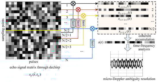 Compared with the micro-Doppler expression in Equation (4), the intra-pulse interference processing converts in the micro-Doppler expression into an equivalent value . In other words, the micro-Doppler value has been shrunk times to avoid ambiguity through intra-pulse interference processing. Nevertheless, the method proposed in this paper does not completely solve the problem of micro-Doppler ambiguity, and what it does is extend the upper limit of ambiguity from PRF/2 to its times, which is large enough to avoid micro-Doppler ambiguity in many applications. The schematic diagram of the micro-Doppler ambiguity resolution method for wideband terahertz radar using intra-pulse interference is shown in Figure 1.